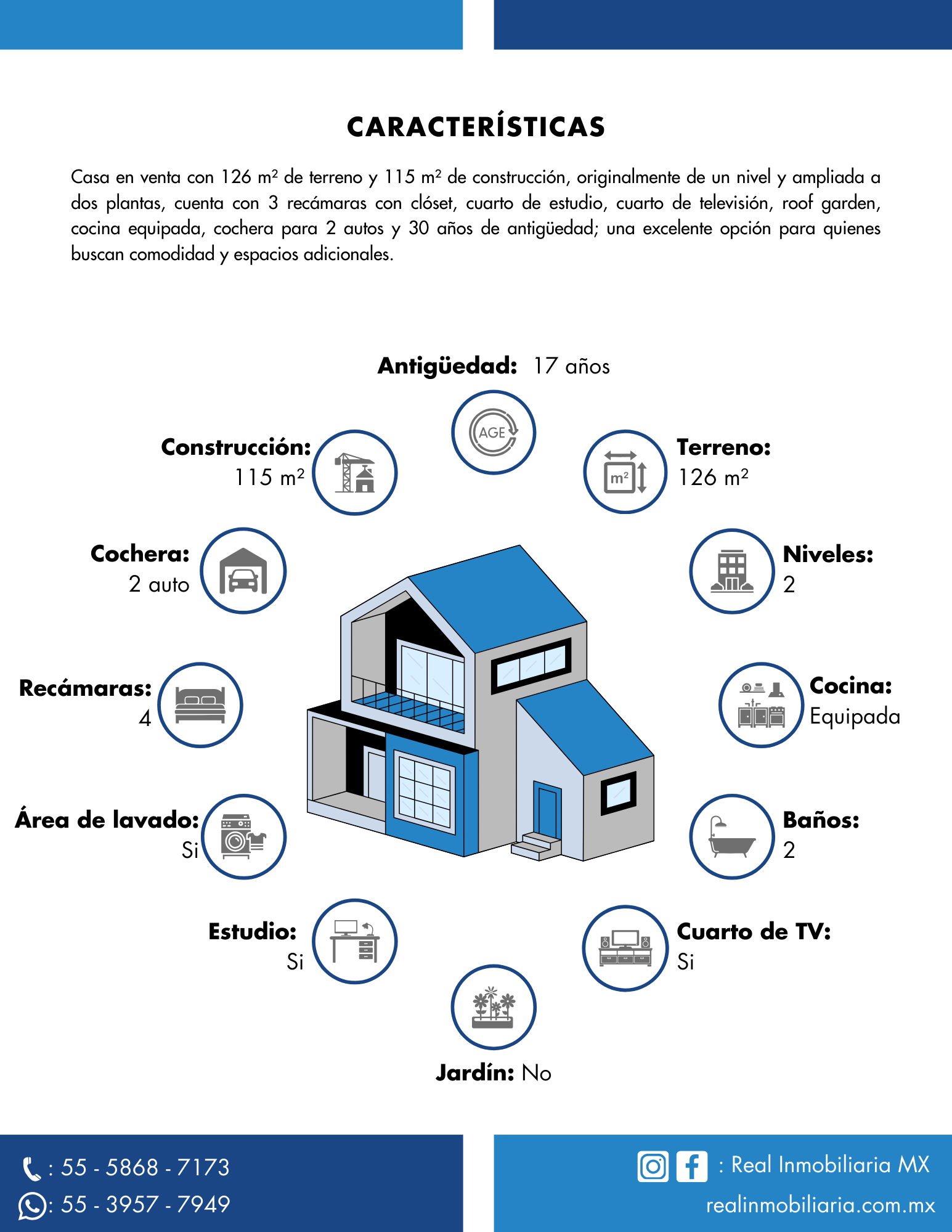 Casa en venta con 126 m² de terreno y 115 m² de construcción, originalmente de un nivel y ampliada a dos plantas, cuenta con 3 recámaras con clóset, cuarto de estudio, cuarto de televisión, roof garden, cocina equipada, cochera para 2 autos y 30 años de antigüedad; una excelente opción para quienes buscan comodidad y espacios adicionales.