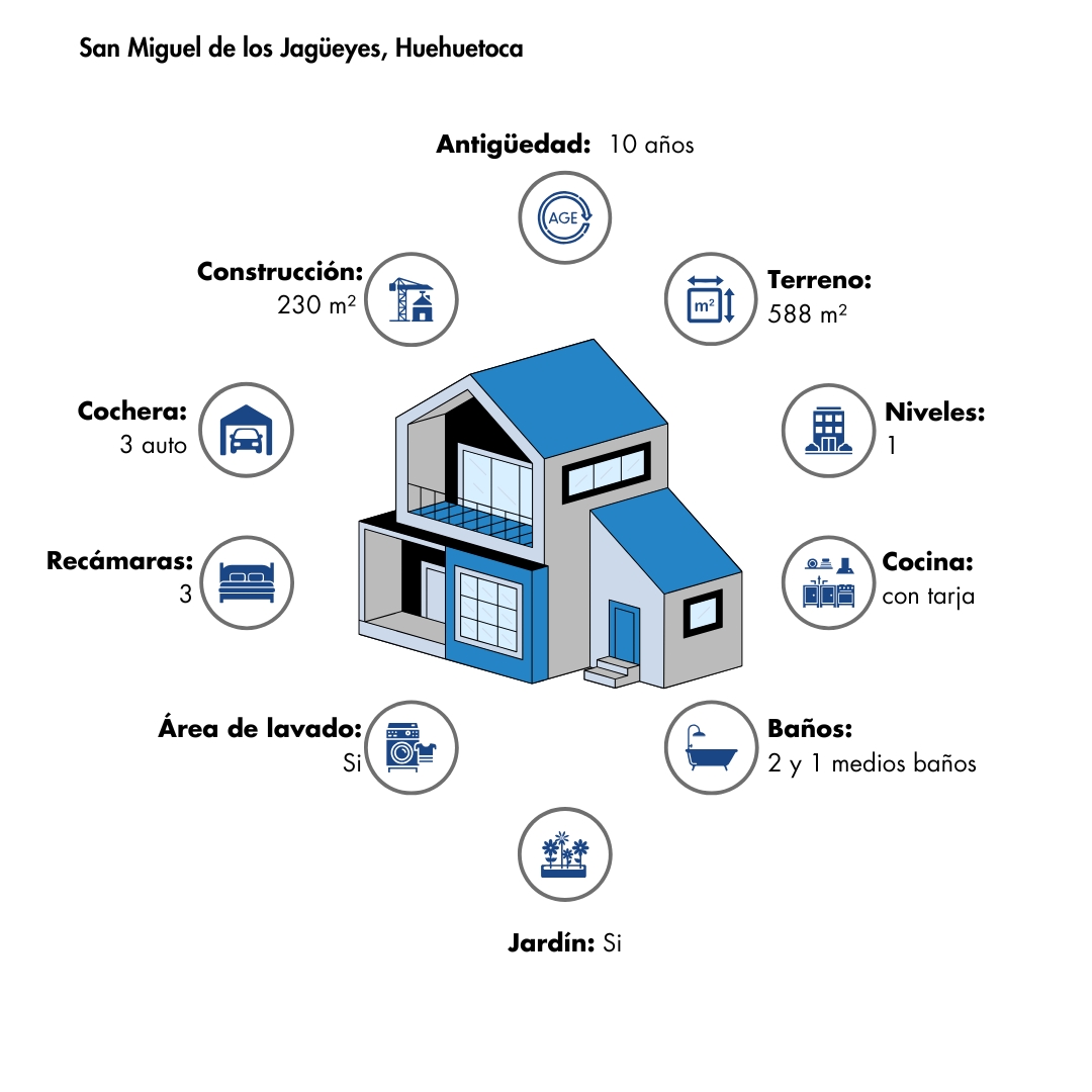Casa tipo rústica construida en un solo nivel sobre calle principal en Huehuetoca. La propiedad cuenta con 500 m² de terreno y 230 m² de construcción, ofreciendo espacios amplios y funcionales como sala, comedor, cocina, 3 recámaras y 2.5 baños. Además, dispone de cochera para 3 autos y cisterna. Su diseño de un nivel brinda practicidad, mientras que el gran terreno ofrece espacio adicional para jardín, ampliaciones o proyectos personales.